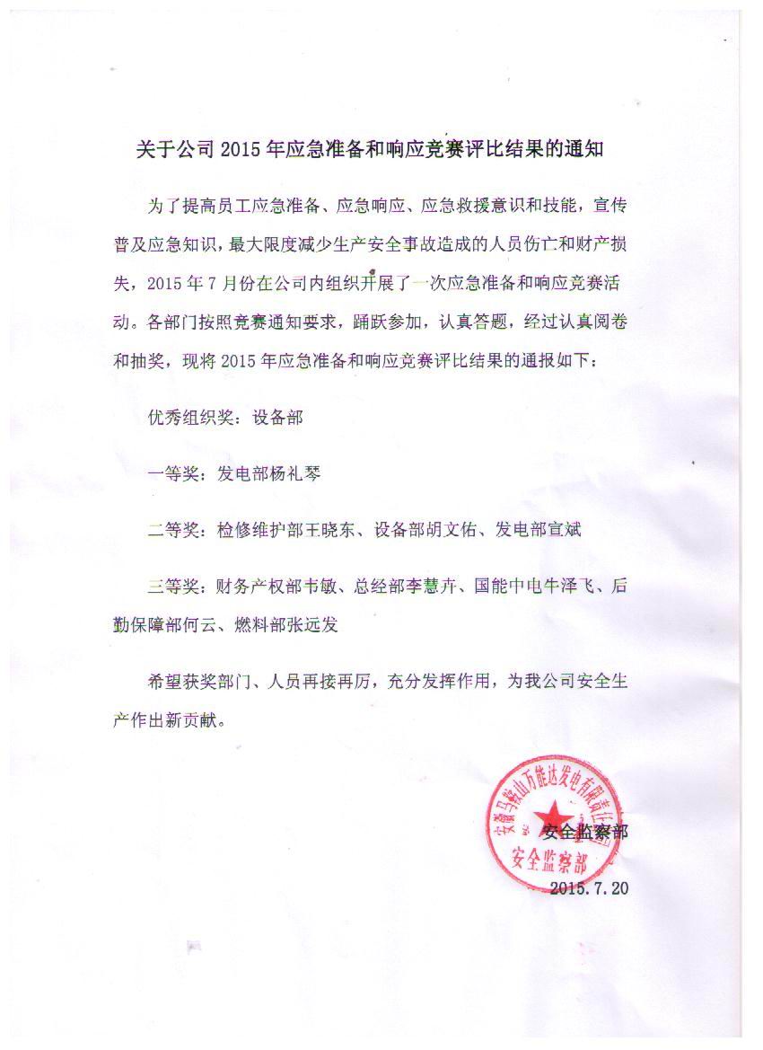 為了提高員工應(yīng)急準(zhǔn)備、應(yīng)急響應(yīng)、應(yīng)急救援意識(shí)和技能,宣傳普及應(yīng)急知識(shí),馬鞍山項(xiàng)目部業(yè)主萬能達(dá)電廠于2015年7月組織開展了應(yīng)急競賽,我公司牛澤飛獲得三等獎(jiǎng),牛澤飛是獲得獎(jiǎng)項(xiàng)的唯一非電廠員工,牛澤飛的獲獎(jiǎng)及展示了公司風(fēng)貌,又體現(xiàn)項(xiàng)目的安全教育頗有成效,既了強(qiáng)化了員工的安全意識(shí),也提高了員工處理應(yīng)急突發(fā)情況的能力。