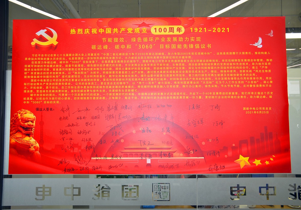 國能中電從活動之初就明確了“提高站位、廣泛參與、精心組織、確保實效”的總體要求,從集團本部到各分子公司,從黨員到群眾都充分認識、深刻領會此次慶祝活動的重要精神,圍繞活動主題精心組織,分步實施,在全公司形成了慶祝中國共產黨成立100周年的濃厚氛圍。活動包含集團公司慶祝中國共產黨成立100周年大會、黨員社會責任倡議書聯名簽署、黨史學習教育專題黨課、優秀先進評選表彰、黨員心聲征集、中共中央“慶祝中國共產黨成立100周年大會”在線觀禮活動等。