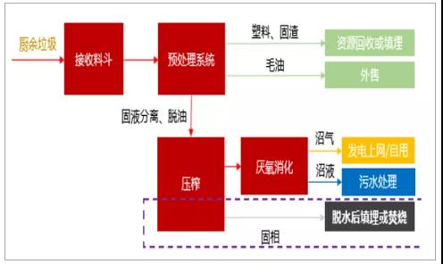 餐廚垃圾的特點包括有機物含量高,含水率高,易腐爛變質,易發酵、發臭,主要是采用厭氧消化、好氧堆肥和飼料化工藝等生物法進行處理。其中厭氧消化工藝能最大化回收油脂,無害化程度高,并能夠充分地對餐廚垃圾中的有機物進行資源化回收和利用,已經有超過70%的餐廚垃圾處理項目使用這條技術路線,是現階段的主流工藝路線。