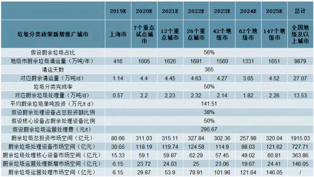 各地級城市垃圾分類推廣節奏逐步釋放。我們依據各城市已推行的垃圾分類政策及各城市生活垃圾清運量及處置規模等屬性推測垃圾分類政策推行進度。考慮到政策實際推行情況,保守假設垃圾分類年化市場釋放節奏為:2019年上海;2020年北京/南京/成都/深圳等7個重點城市;2021年重慶/天津/蘇州等12個重點城市;2022年46個重點城市中剩余的26個重點城市;2023年保定/大同/吉林等42個地級市;2024年邢臺/淮安/九江等62個地級市;2025年剩余的地級市。在空間測算中均以該推廣節奏為前提進行測算。